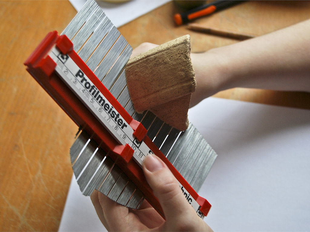 Nun wird mit dem Zeichenkamm die Innenseite der Scherbe abgenommen. |