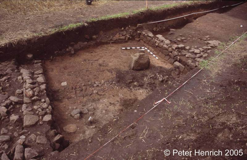 Ausgewählt wurden zwei Bereiche, die für diese Fragestellung erfolgversprechend erschienen. Im Rahmen der ersten Sondage wurde ein im Magnetogramm als Sechspfostenbau zu deutender Befund untersucht. Die zweite Sondage diente der Klärung eines Magnetikbefundes, der aufgrund seiner Lage und Struktur sowie der hydrologischen Verhältnisse bislang als Wasserbecken interpretiert wurde (Henrich/Tabaczek, 2003, 15).