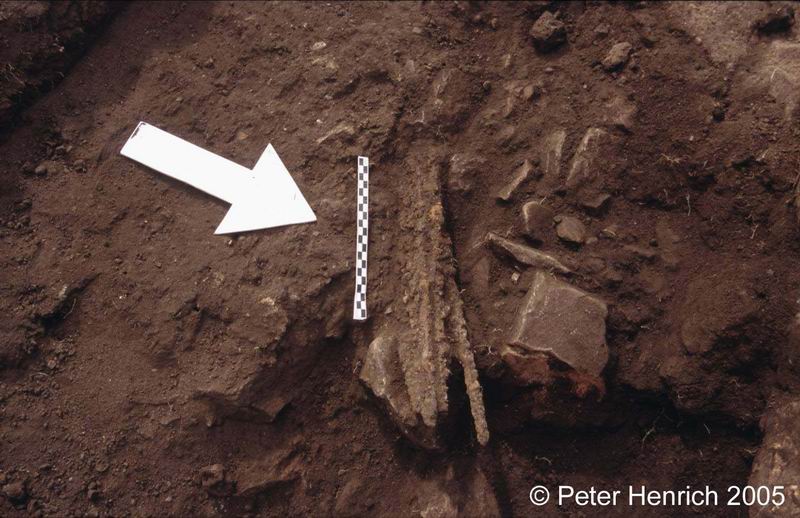 Die Existenz eines weiteren im Magnetogramm erkennbaren Befundes knapp außerhalb der südlichen Pfostenreihe konnte bei den Grabungen nicht bestätigt werden. Vermutlich handelte es sich um eine Störung, wie z. B. ein größeres Eisenobjekt im Humus, das beim maschinellen Abtrag dieser Schicht nicht zu erkennen oder auch gar nicht mehr vorhanden war.