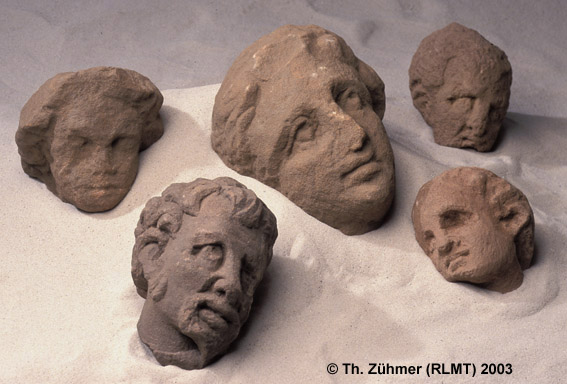 Die Ausgrabung fand für den Zeitraum von acht Wochen im August und September 2002 statt. Dabei konnten zwei zeitlich aufeinander folgende Grabdenkmäler dokumentiert werden (Abb.1). Das ältere der beiden besaß ein Fundament von ca. 7m x 7m und war von einer Umfassungsmauer von 18m x 19m umgeben. Südlich daran schloss sich die Umfassungsmauer eines jüngeren Grabmals von 11,6m x 10,6m an. Im Inneren befand sich das Fundament des Grabmals von 5,2m x 4,2m. Von beiden Bauwerken konnten insgesamt 770 Skulpturenfragmente aus Sandstein (Abb. 2) geborgen werden. Besonders bemerkenswert sind zahlreiche Fragmente von Tier-, Fabelwesen- und Menschendarstellungen. Eine herausragende Stellung nimmt hierbei ein vollständig erhaltener, 50cm x 80cm großer, rundplastisch ausgearbeiteter Greifenkopf (Abb. 3) ein. Nach bisheriger Analyse muss aufgrund der Funde mindestens eines der beiden Grabdenkmäler in Analogie zur Igeler Säule bei Trier rekonstruiert werden.