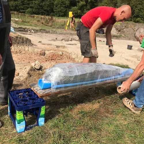 Das Grabungsteam unter Leitung von Dr. Peter Henrich und Johanna Steffestun arbeitete gerade intensiv an der Freilegung eines Holzpfostens. Nach der Bergung – schon bei Dunkelheit – zeigte sich dann ein herausragendes Fundstück: ein ca. 140 cm langer Holzpfosten, der wohl in römischer Zeit in den Lehmboden gerammt wurde. Nun steht der Transport in das Rheinische Landesmuseum Trier an. Mit Spannung erwarten wir die dendrochronologische Untersuchung und damit neue Erkenntnisse über das Gebäude und das Umfeld.
