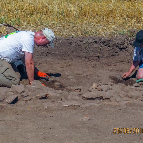 Entsprechend dem Thema "Römische Schmiede und Eisenverhüttung" wurden am Montag vergangener Woche 3 Flächen mit dem Bagger geöffnet. Im Laufe der Woche konnten so die Strukturen eines weiteren Raumes im Anschluss an das Schmiedegebäude von 2010 freigelegt werden. In der Nähe dieser Fläche ist ein kleines Gebäude, das aus einem Raum besteht, bearbeitet worden. Die dritte Fläche ist im Bereich der Eisenverhüttung.