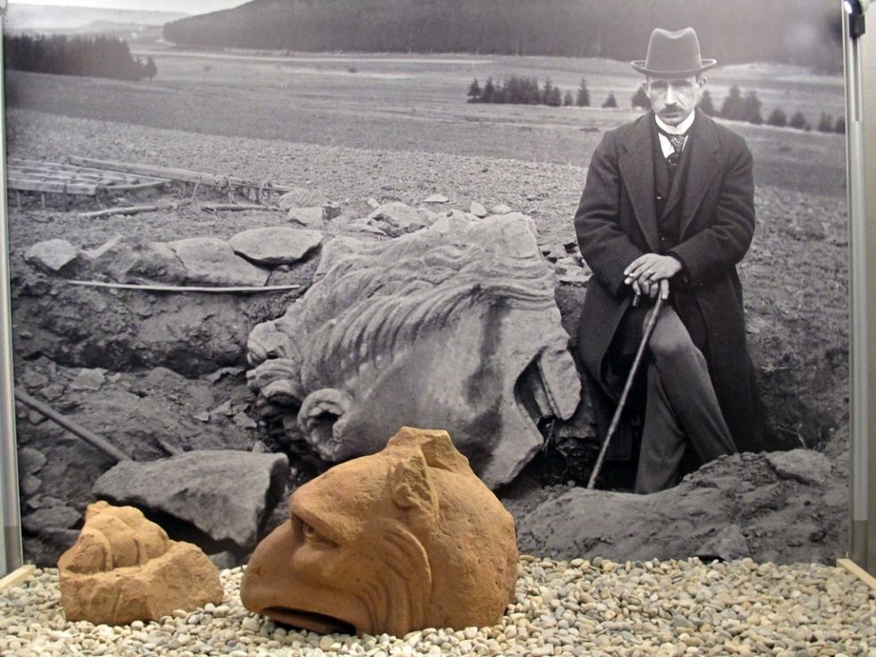 Ein beeindruckendes Bild am Beginn der Ausstellung: In Lebensgröße eine Fotografie vom damaligen Dorfschullehrer Funk neben der Löwen-Eber-Gruppe vor dem Abtransport in das Rheinische Landesmuseum Trier im Jahre 1921. Vor diesem Foto eine Replik des Greifenkopfes und Teil einer Tatze.