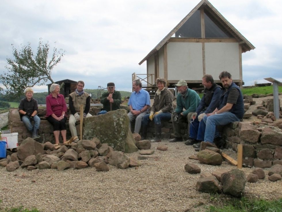 Während der Woche konnte wirklich nur stundenweise - je nach Wetterlage - gearbeitet werden. Heute war jedoch eine tolle Truppe zusammen, so dass man bis zum ersten richtigen Regenguss um 15.00 Uhr sehen konnte, wie die Exedra sich dem annähert, was sie werden soll: ein Sitzkreis. Eine erste Sitzprobe wurde nach dem Mittagessen selbstverständlich vorgenommen.