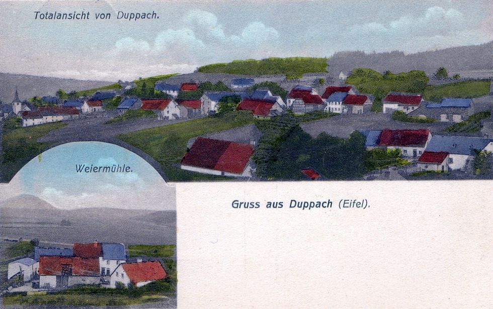 Damals (so wie auf dieser Postkarte aus dem ersten Jahrzehnt des letzten Jahrhunderts) war das so: Es gab Duppach, und es gab die Weiermühle. Zumindest daran hat sich bis heute nichts geändert. Verschwunden sind inzwischen der Turm der alten Pfarrkirche und der Vulkankegel im Hintergrund der Weiermühle - die Spitze des Steffelberges fiel vollständig Basalt/Lava-Abbau zum Opfer.