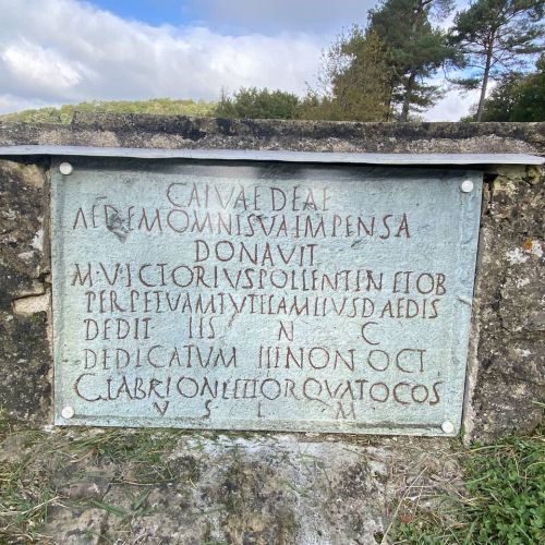 „Der Göttin GAIVA schenkte den Tempel ganz aus eigenen Mitteln Marcus Victorius Pollentinius und gab zu dauerndem Unterhalt desselben Tempels 100 000 Sesterzen. Eingeweiht am dritten Tage vor den Nonnen des Oktober unter dem Konsulat des Glabrio und des Torquatus. Er löste dadurch ein Gelübde willig, schuldigermaßen.“