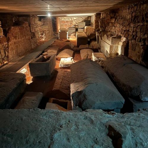Die Zeitreise begann unter der massiven Betondecke der ehemaligen Abteikirche St. Maximin, wo sich dieses spätantike Gräberfeld befindet. Die ältesten der über 1000 Sarkophage, die hier unter anderem zu entdecken sind, stammen aus dem 2. Jahrhundert und wurden zum Teil als Fundamente für die heutige Kirche benutzt. Während der Führung konnte an vielen Stellen gezeigt werden, die im Laufe der Jahrhunderte Baumaterial „recycelt“ wurde.
