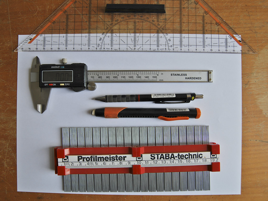 Für das Zeichnen von Keramik ist zunächst die richtige Ausrüstung nötig. Man benötigt ein weißes Blatt Papier, einen Druckbleistift, ein Radiergummi, ein Geodreieck, ein Zeichenkamm, eine Schieblehre, einen Durchmesserkreis und natürlich eine Scherbe. |
