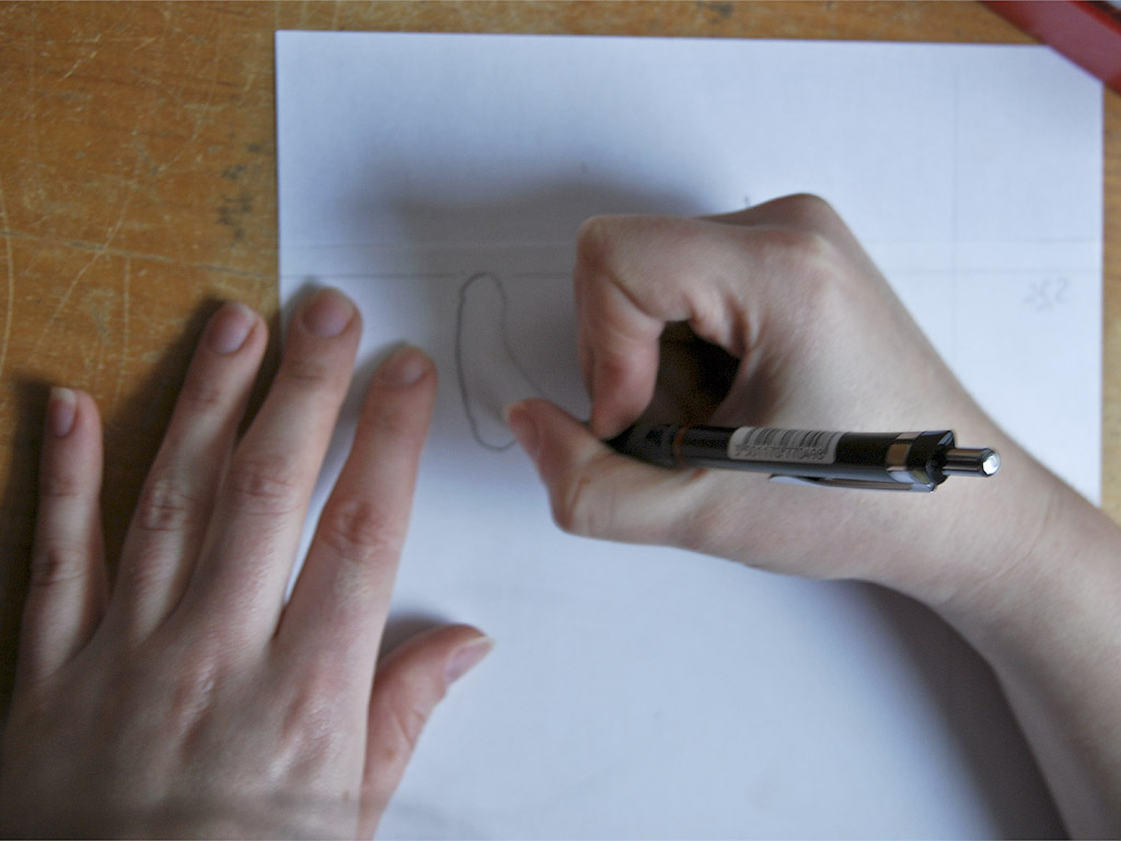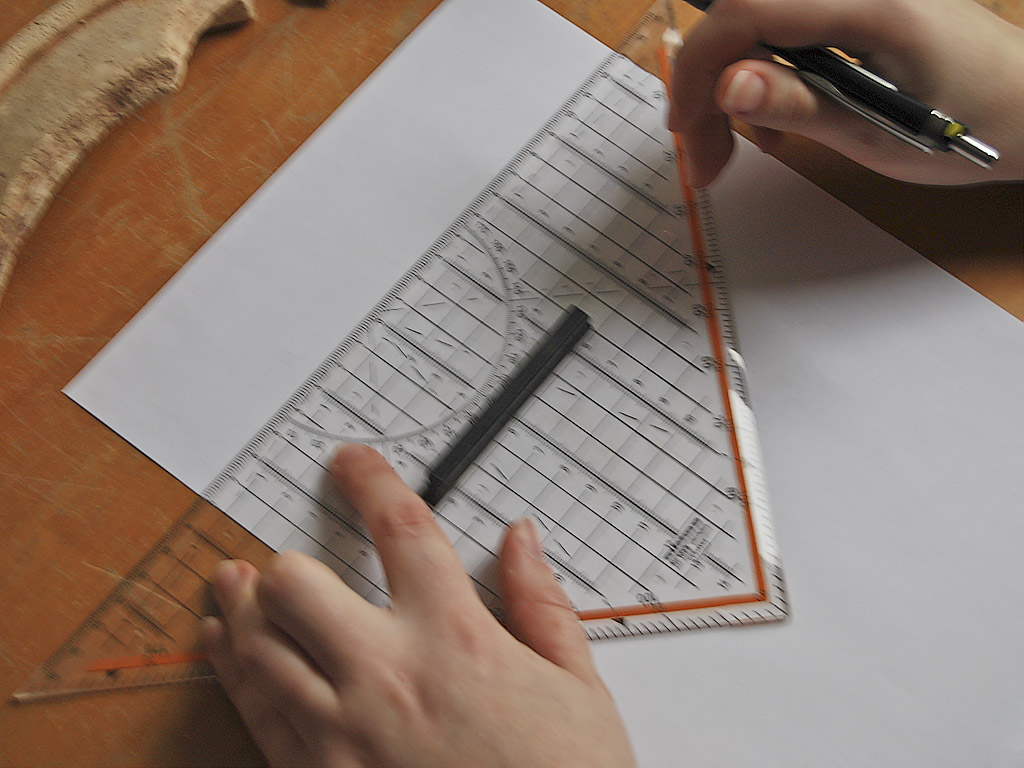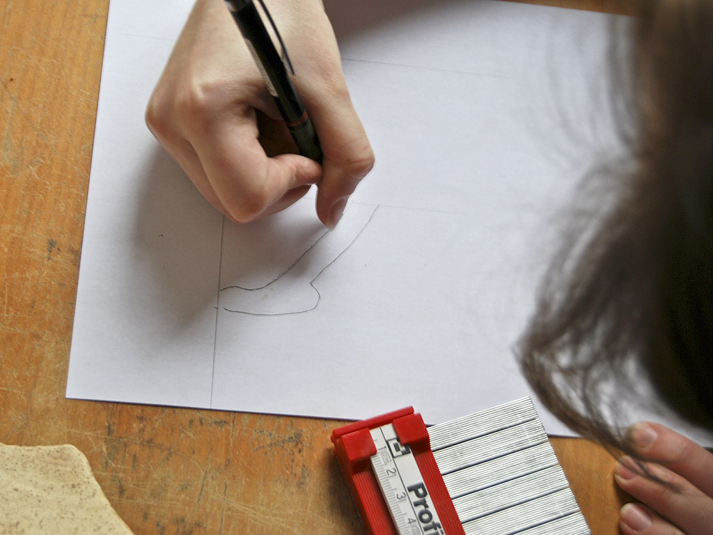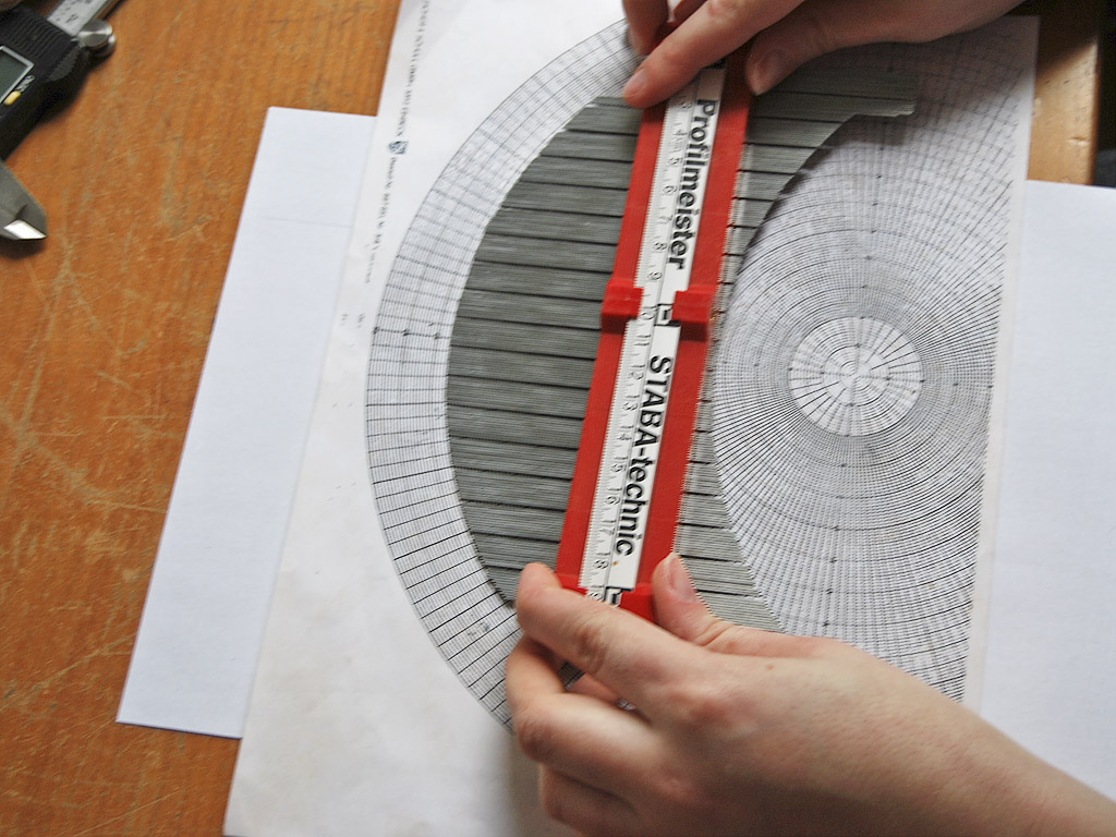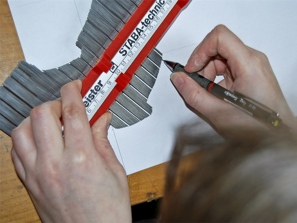 Durch die Punkte, die zuvor mit der Schieblehre ermittelt wurden, kann nun genau gesagt werden, wie man die „Schablone“ anlegen muss. Diese zeichnet man dann wieder nach. Auch hier können nachher Korrekturen mit dem Radiergummi gemacht werden. |