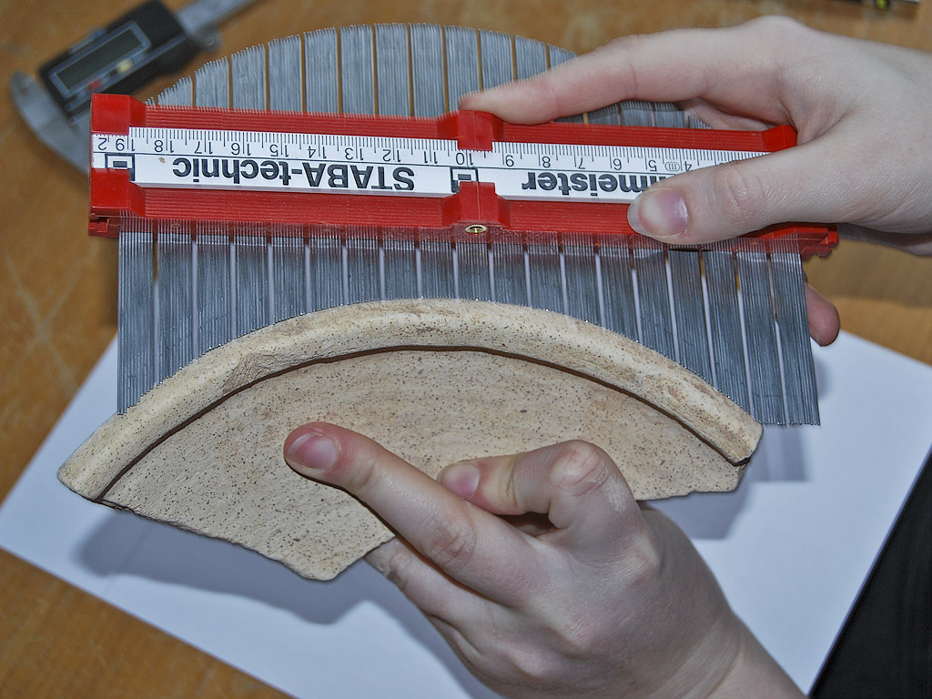 Der nächste Schritt besteht darin, die Außenlinie der Scherbe mit dem Zeichenkamm abzunehmen. |