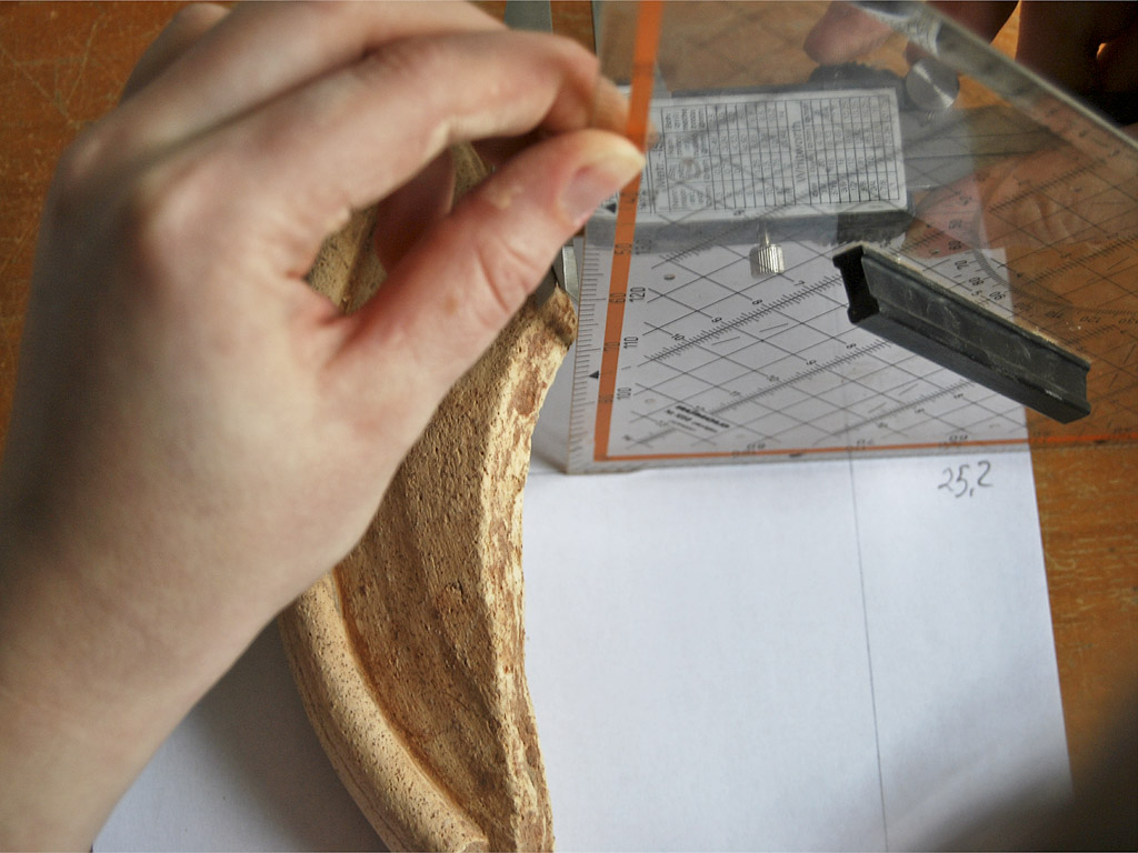 Nun wird mit dem Zeichenkamm die Innenseite der Scherbe abgenommen. |