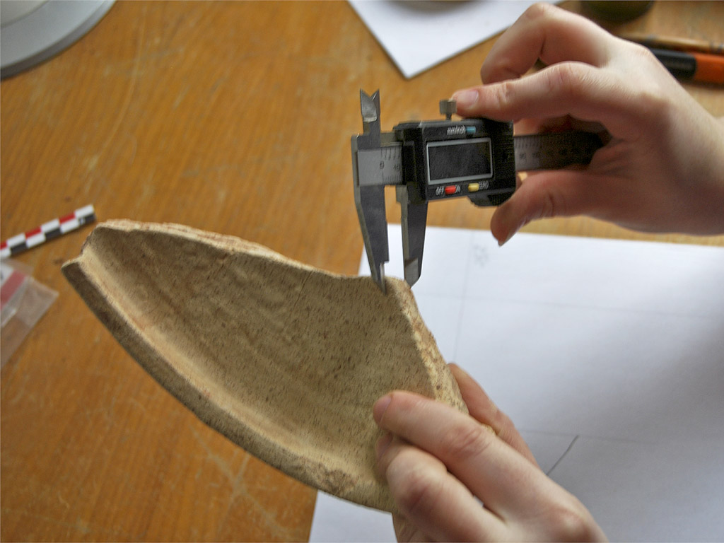 Natürlich ist das nur eine Vorzeichnung. Nun geht man die Linien noch einmal ordentlich nach und kontrolliert, ob kein Detail der Scherbe fehlt. Fehlt etwas, nimmt man noch einmal mit dem Kamm ab oder zeichnet es direkt an der Scherbe ab.Dann nimmt man mit der Schieblehre mehrere Stärken der Scherbe ab und zeichnet sie durch Punkte an die passenden Stellen auf dem Blatt. |