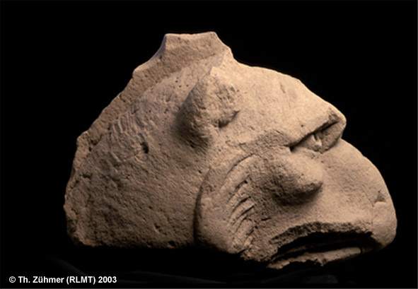 Die Ausgrabung fand für den Zeitraum von acht Wochen im August und September 2002 statt. Dabei konnten zwei zeitlich aufeinander folgende Grabdenkmäler dokumentiert werden (Abb.1). Das ältere der beiden besaß ein Fundament von ca. 7m x 7m und war von einer Umfassungsmauer von 18m x 19m umgeben. Südlich daran schloss sich die Umfassungsmauer eines jüngeren Grabmals von 11,6m x 10,6m an. Im Inneren befand sich das Fundament des Grabmals von 5,2m x 4,2m. Von beiden Bauwerken konnten insgesamt 770 Skulpturenfragmente aus Sandstein (Abb. 2) geborgen werden. Besonders bemerkenswert sind zahlreiche Fragmente von Tier-, Fabelwesen- und Menschendarstellungen. Eine herausragende Stellung nimmt hierbei ein vollständig erhaltener, 50cm x 80cm großer, rundplastisch ausgearbeiteter Greifenkopf (Abb. 3) ein. Nach bisheriger Analyse muss aufgrund der Funde mindestens eines der beiden Grabdenkmäler in Analogie zur Igeler Säule bei Trier rekonstruiert werden.