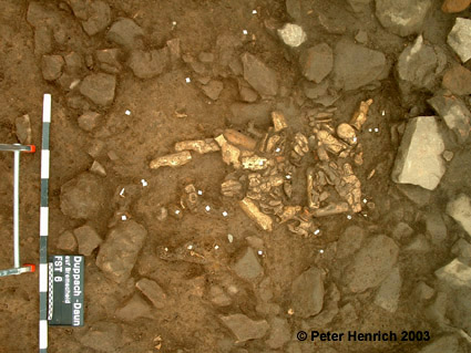 Vom dazugehörigen Gräberfeld konnten vier Bestattungen und zwei Aschegruben (Abb. 4) dokumentiert werden. Die Gräber sind Urnenbestattungen in Steinplattengräbern (Abb. 5) . Aus den Aschegruben stammen neben zahlreichen Keramik- und Glasgefäßen auch verkohlte Reste von römischen Backwaren aus dem 3. Jh. n. Chr. In unmittelbarer Nähe der Gräber konnte ein Depot mit ca. 45 vollständigen Terrakotten (Abb. 6), die zumeist Muttergottheiten darstellen, geborgen werden.