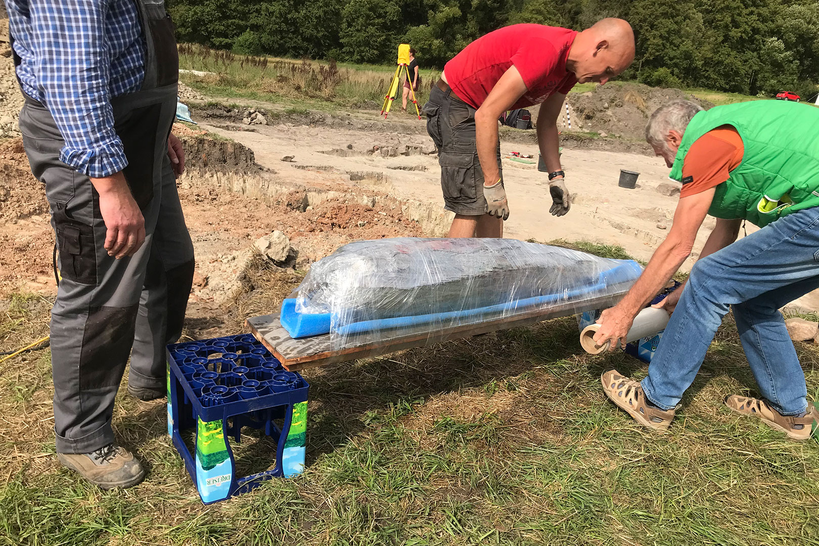 Das Grabungsteam unter Leitung von Dr. Peter Henrich und Johanna Steffestun arbeitete gerade intensiv an der Freilegung eines Holzpfostens. Nach der Bergung – schon bei Dunkelheit – zeigte sich dann ein herausragendes Fundstück: ein ca. 140 cm langer Holzpfosten, der wohl in römischer Zeit in den Lehmboden gerammt wurde. Nun steht der Transport in das Rheinische Landesmuseum Trier an. Mit Spannung erwarten wir die dendrochronologische Untersuchung und damit neue Erkenntnisse über das Gebäude und das Umfeld.