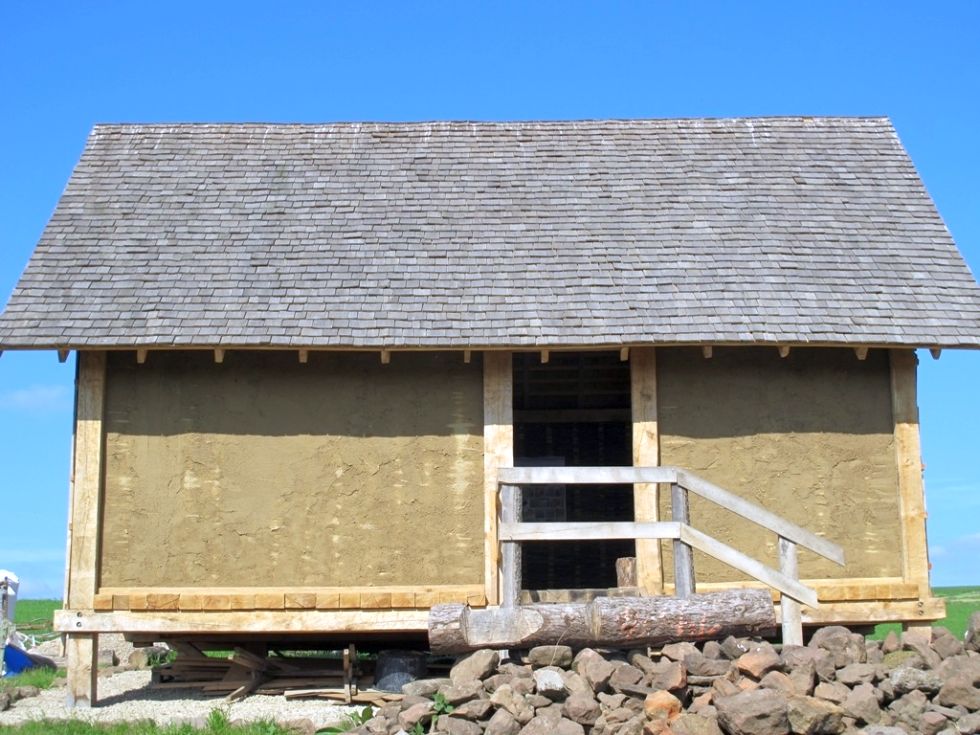 Wie es funktioniert und ob es funktioniert , das wurde - wie so viele Arbeiten vorher - mit Erfolg getestet. Den Lehmputz in der richtigen Konsistenz anmischen und dann am Flechtwerk anbringen - auch hierfür gilt „Übung macht den Meister”. Auf zwei von insgeamt acht Feldern ist die erste Schicht aufgebracht, weitere werden folgen.