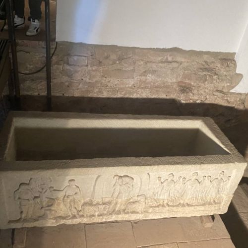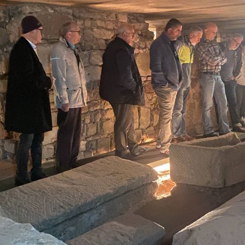 Die Zeitreise begann unter der massiven Betondecke der ehemaligen Abteikirche St. Maximin, wo sich dieses spätantike Gräberfeld befindet. Die ältesten der über 1000 Sarkophage, die hier unter anderem zu entdecken sind, stammen aus dem 2. Jahrhundert und wurden zum Teil als Fundamente für die heutige Kirche benutzt. Während der Führung konnte an vielen Stellen gezeigt werden, die im Laufe der Jahrhunderte Baumaterial „recycelt“ wurde.