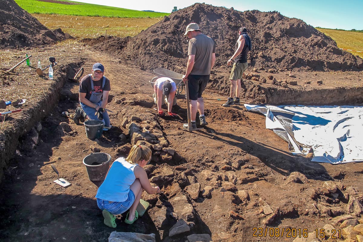 Mit jedem Arbeitstag der Archäologen und der "Hobby-Archäologen" stellt sich die Fundsituation deutlicher dar. Ein spannender Prozess an dessen Ende wieder neue Erkenntnisse stehen werden. Bis zum Tag des offenen Denkmals am 11.09.2016 ist also noch viel zu tun. Da der Start in die 2. Grabungswoche für das Grabungsteam vom Wetter her wesentlich angenehmer war, wird der vorgegebene Zeitplan mit Sicherheit eingehalten werden.