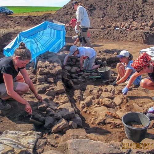 Entsprechend dem Thema "Römische Schmiede und Eisenverhüttung" wurden am Montag vergangener Woche 3 Flächen mit dem Bagger geöffnet. Im Laufe der Woche konnten so die Strukturen eines weiteren Raumes im Anschluss an das Schmiedegebäude von 2010 freigelegt werden. In der Nähe dieser Fläche ist ein kleines Gebäude, das aus einem Raum besteht, bearbeitet worden. Die dritte Fläche ist im Bereich der Eisenverhüttung.