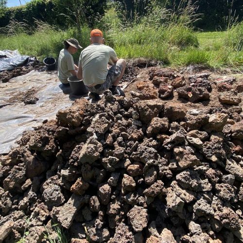Ursprünglich war geplant, dass die Aussortierung der Schlacke nach Fließ- und Schmiedeschlacke – entsprechend der Anleitung von Dr. Marion Berranger – durch Vereinsmitglieder erfolgen sollte. Die Gemeinschaftsaktion der beiden Archäologen war jedoch so erfolgreich und intensiv, dass nicht nur die Begutachtung, sondern gleichzeitig auch die Sortierung erfolgte.